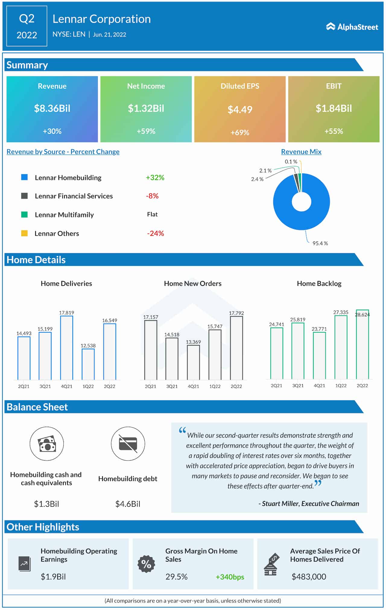 Lennar’s revenue increased 30% year-over-year to $8.4 billion in the second quarter of 2022. Revenues from home sales were up 33%, driven mainly by double-digit increases in the number of home deliveries and average sales price. The company’s earnings increased 69% to $4.49 per share on a GAAP basis and 59% to $4.69 per share on an adjusted basis.