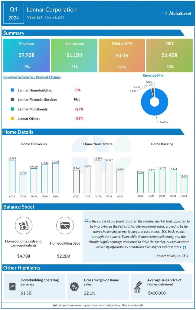 Lennar generated revenue of $9.9 billion in Q4 2024, down 9% year-over-year. Adjusted earnings per share decreased 22% to $4.03. Revenues from home sales declined 9%, mainly due to decreases in deliveries and average sales price.