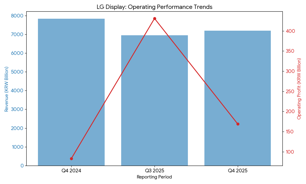 For the three-month period ending December 31, 2025, LG Display reported consolidated revenue of KRW 7,201 billion. This represents an 8% decrease compared to KRW 7,833 billion in the fourth quarter of 2024. The company posted a net loss of KRW 351 billion for the quarter, compared to a net loss of KRW 839 billion in the prior-year period. Operating profit for the quarter was KRW 169 billion.