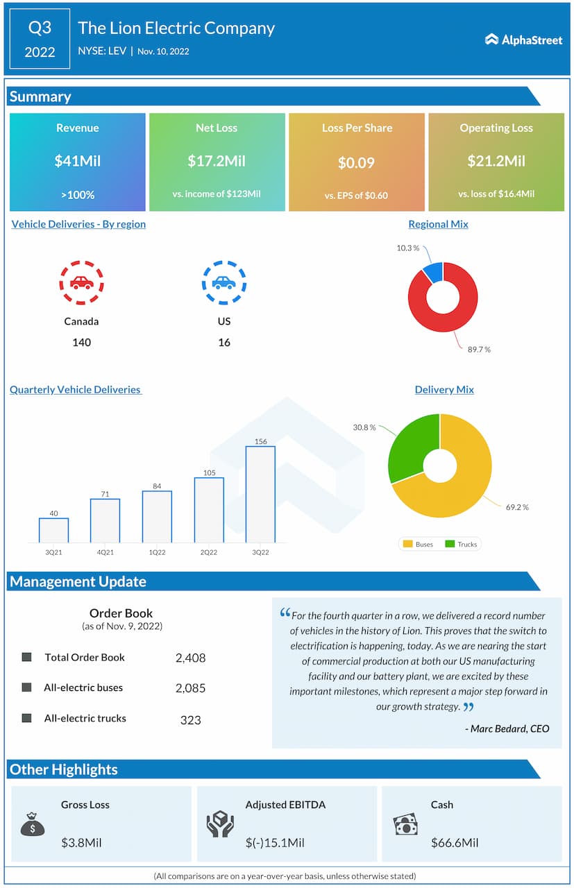 The Lion Electric Company (NYSE: LEV) reported revenue of $41 million for the third quarter of 2022, compared to $11.9 million in the same period last year.