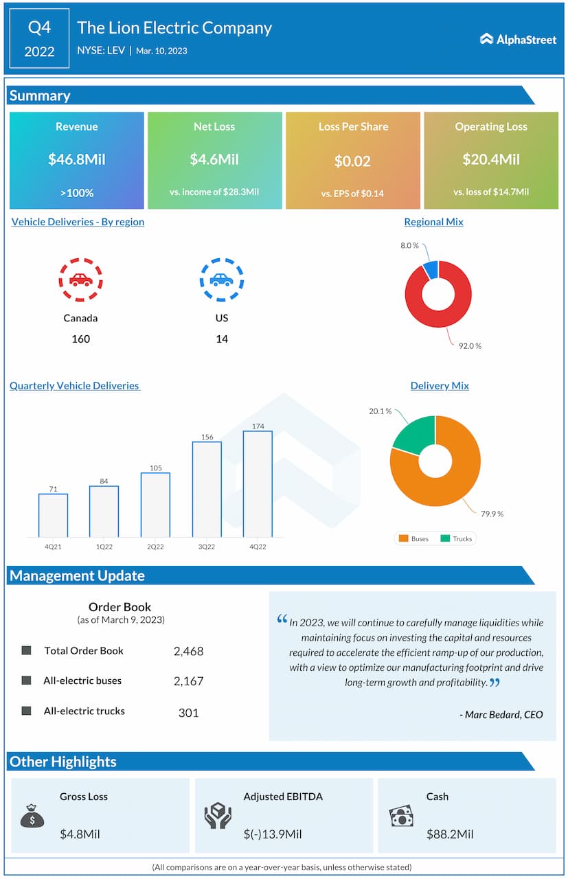 The Lion Electric Company (NYSE: LEV) reported revenue of $46.8 million for the fourth quarter of 2022 compared to $22.9 million in the same period a year ago.