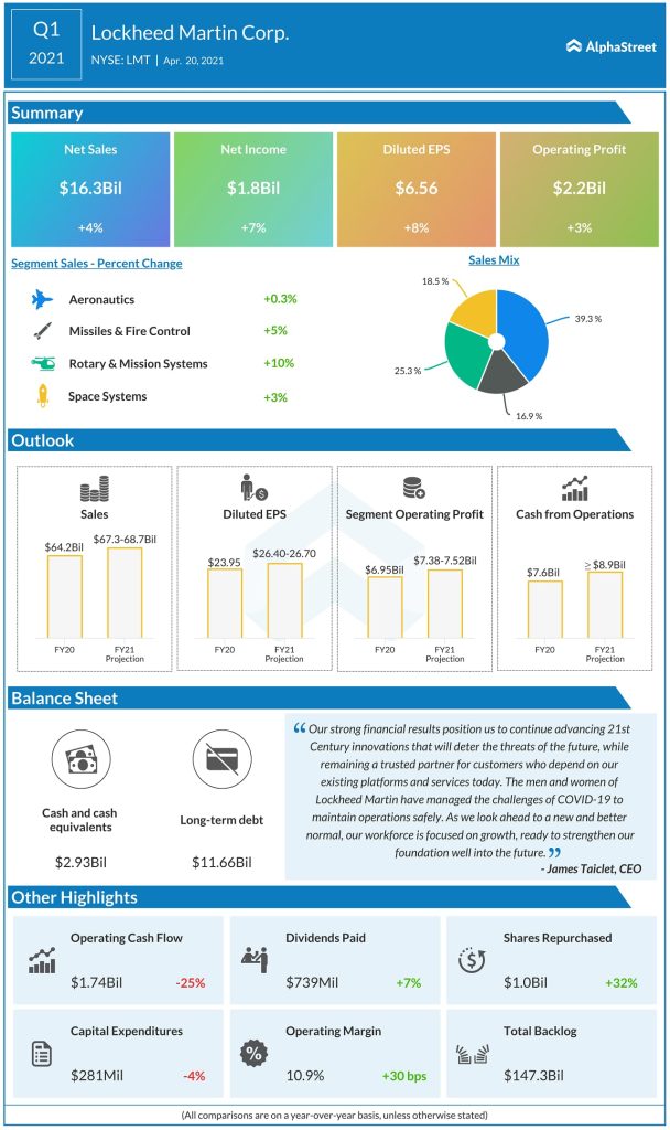 Lockheed Martin Corp. (NYSE: LMT) today reported its first quarter financial results for the period ended March 28, 2021.