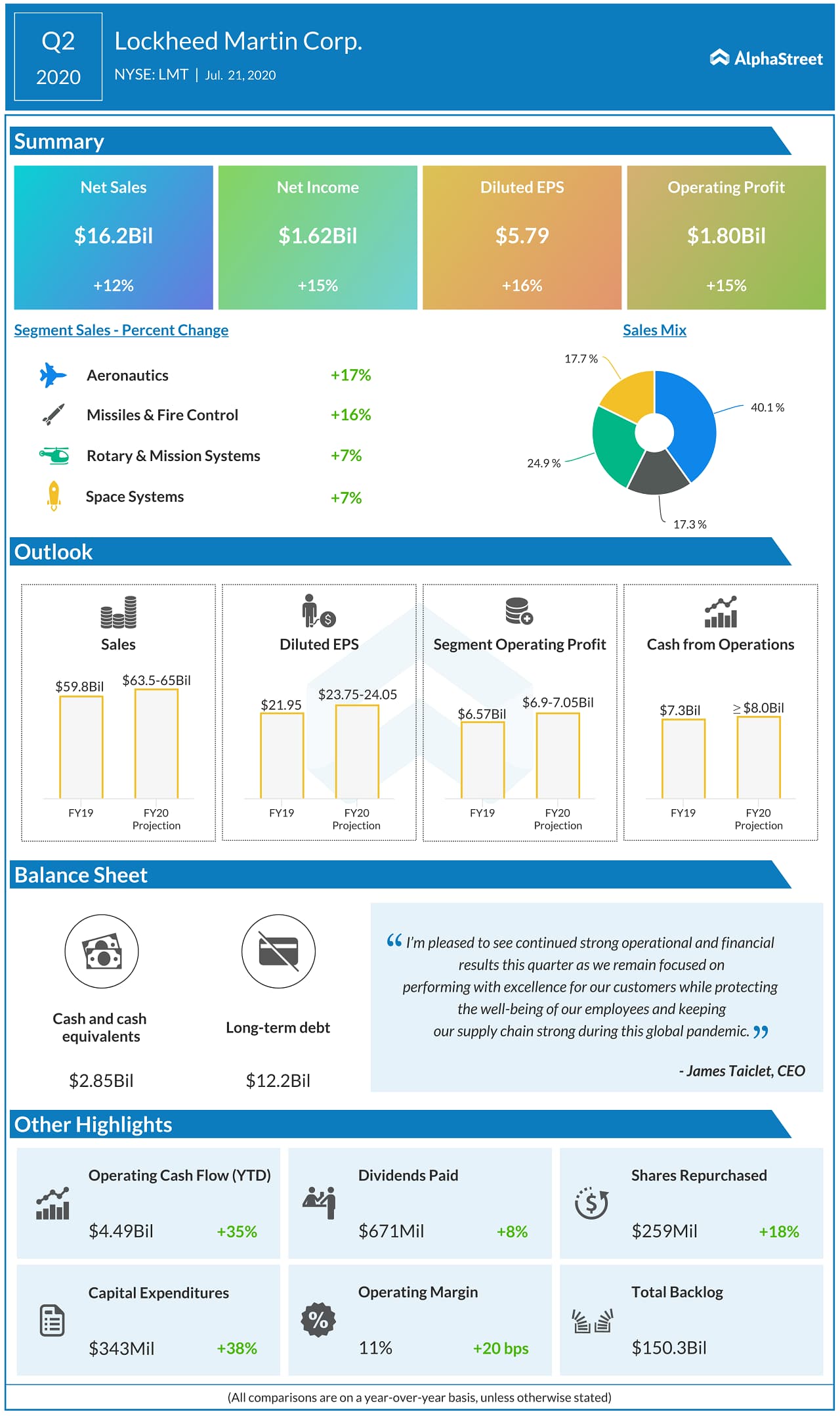 Lockheed Martin Corp. (NYSE: LMT) today announced its second quarter financial results for the period ended June 28, 2020.