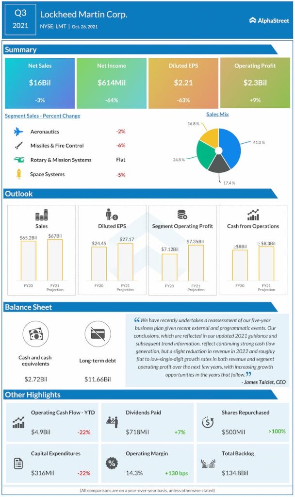 “Lockheed Martin Corporation (NYSE: LMT) reported net sales of $16 billion for the third quarter of 2021. Net earnings amounted to $614 million, or $2.21 per share, compared to $1.69 billion, or $6.05 per share, last year. For the full year of 2021, net sales are expected to be $67 billion.