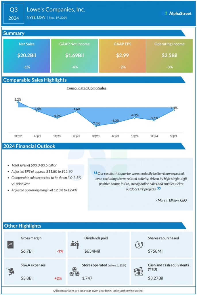 Lowe’s updated its guidance for the full year of 2024. The company now expects total sales of $83.0-83.5 billion. Comparable sales are now expected to be down 3.0-3.5% from last year. Adjusted EPS is expected to be approx. $11.80-11.90.