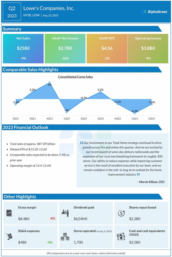 Lowe’s expects net sales to range between $87-89 billion for the full year of 2023. Comparable sales are expected to be down 2-4%, reflecting impacts from lumber deflation. The company expects strength to continue in Pro and online while DIY discretionary purchases are expected to remain pressured. Adjusted EPS is expected to be $13.20-13.60 for the full year.