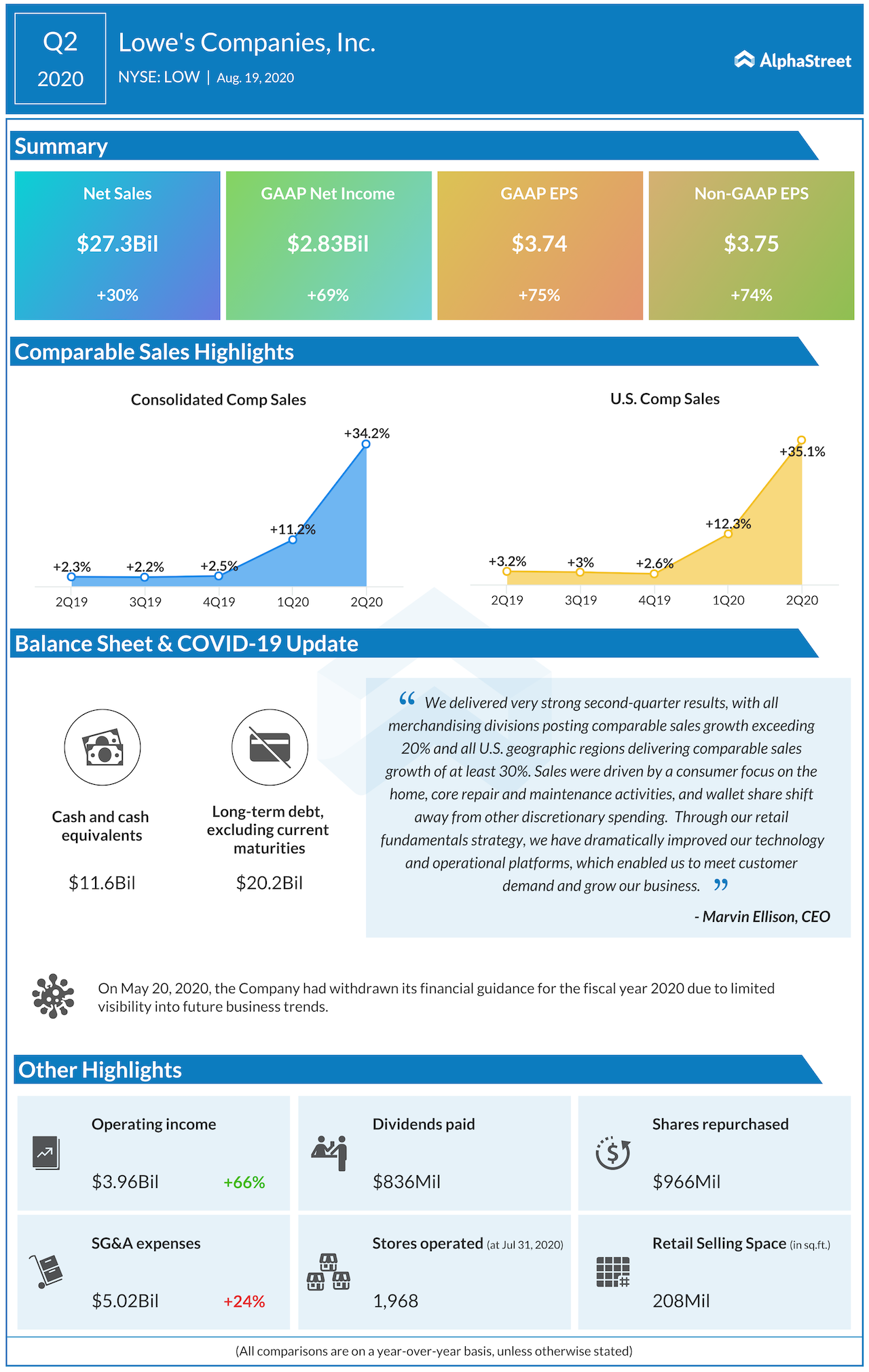 Lowe’s CEO Marvin R. Ellison said, “Looking ahead, our sales momentum continues into August, and we are investing in the business to further our omnichannel capabilities and position the Company to deliver long-term value to associates, customers and shareholders.”