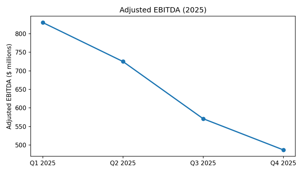 Shares fell intraday following the results. Quarterly revenue declined 9% to $3.041 billion. Adjusted EBITDA excluding special items was $767 million. The quarter combined a narrowed net loss with significant debt reduction tied to the completed transaction.
