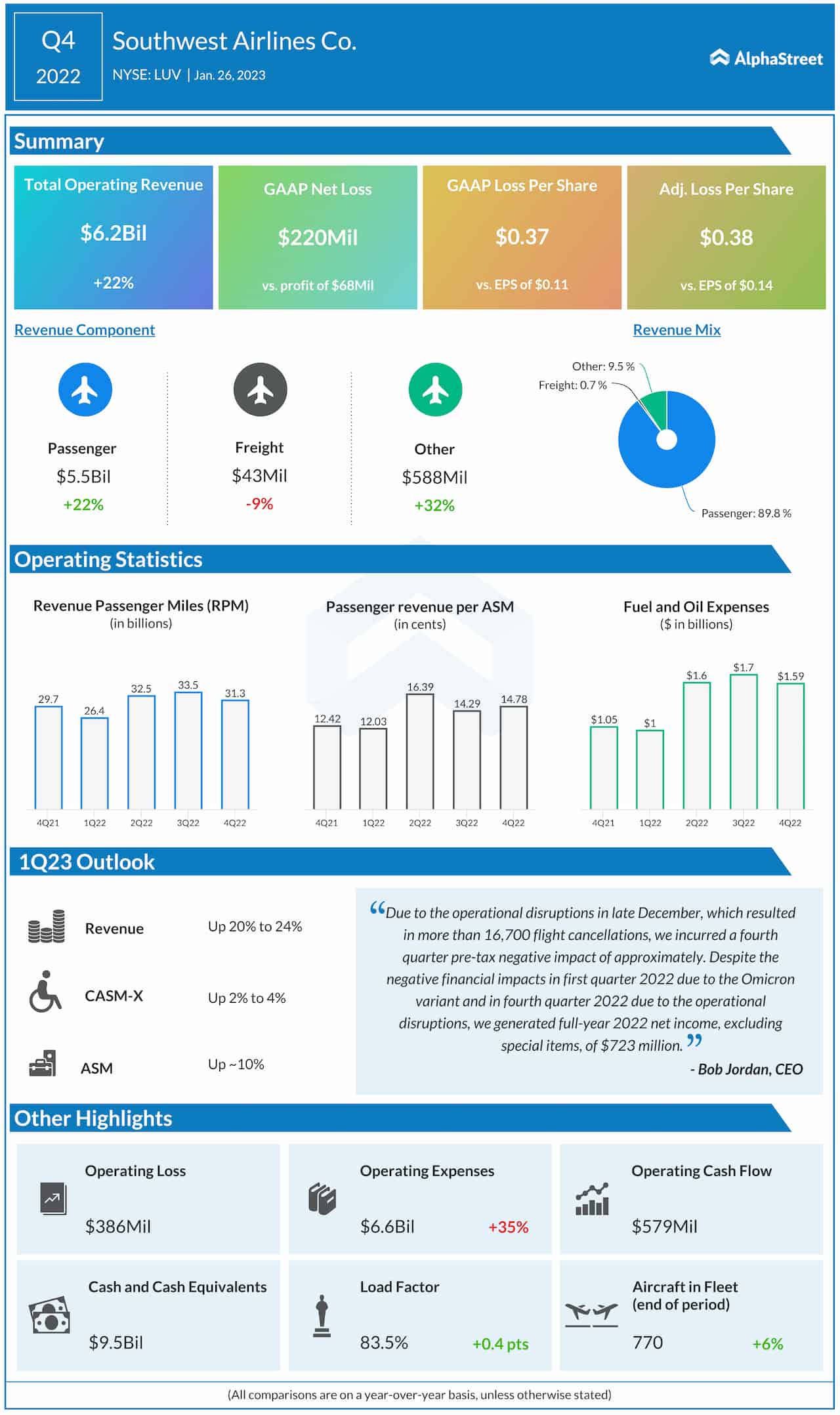 Southwest Airlines Co. (NYSE: LUV) on Thursday announced financial results for the fourth quarter of 2022, reporting a net loss and a double-digit increase in revenues.