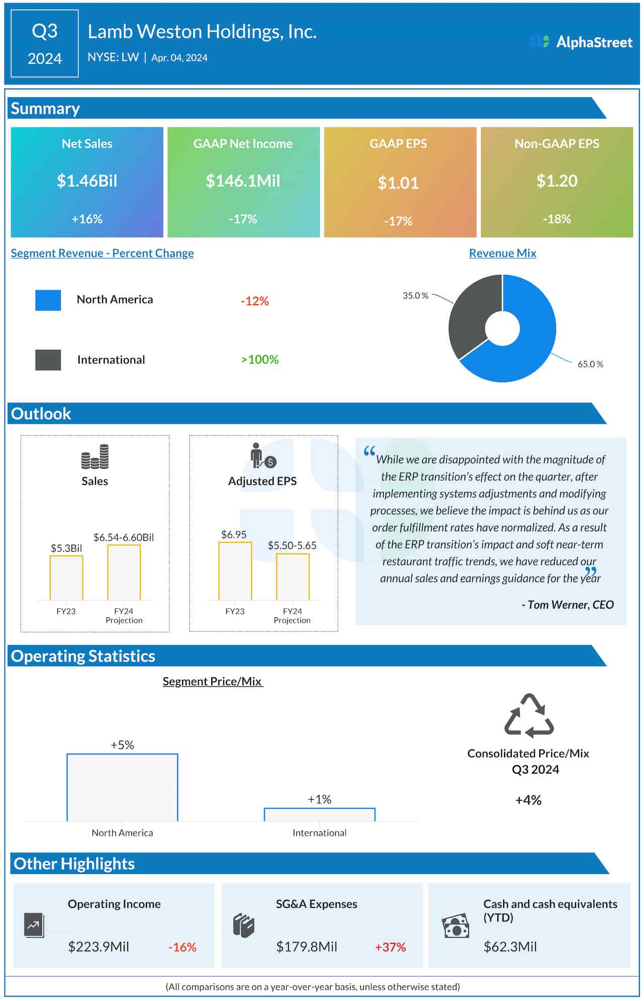 Lamb Weston Holdings, Inc. (NYSE: LW), a leading supplier of frozen potato products to restaurants and retailers, reported lower adjusted earnings for the third quarter of 2024, despite a double-digit increase in net sales.