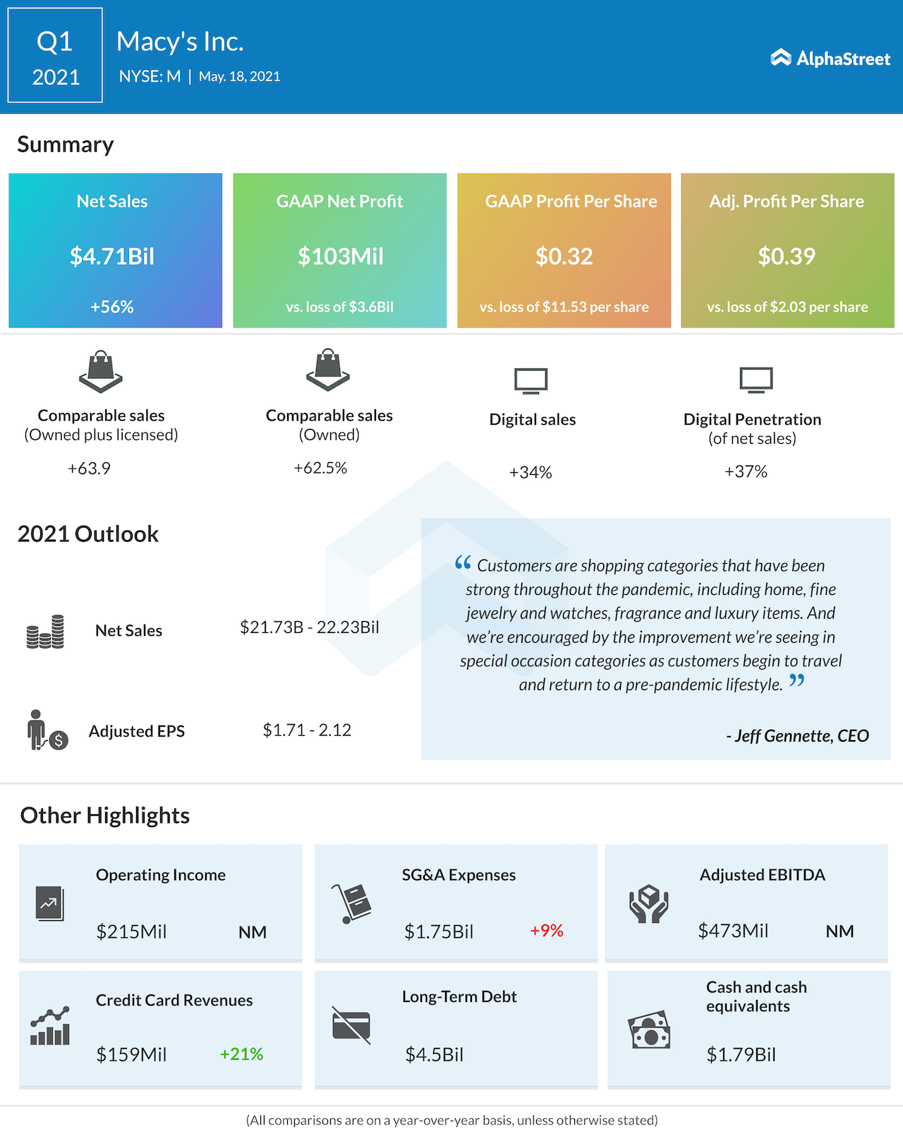 Macy’s (NYSE: M) reported first-quarter 2021 financial results before the regular market hours on Tuesday. The department store chain reported Q1 revenue of $4.71 billion, up 56% year-over-year and above the Wall Street projection. Meanwhile, the company reported net earnings of $0.39 per share, even as the street was expecting a loss.