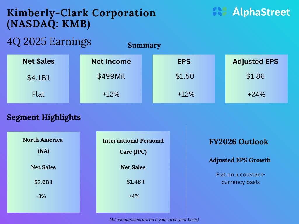 Kimberly-Clark reported net sales of $4.08 billion for the fourth quarter of 2025, which dipped 0.6% from the same period a year ago and narrowly missed estimates of $4.09 billion. Organic sales grew 2.1%, driven by volume-plus-mix growth of 3%. GAAP earnings per share increased 12% to $1.50 compared to last year. Adjusted EPS grew 24% year-over-year to $1.86, beating projections of $1.81.