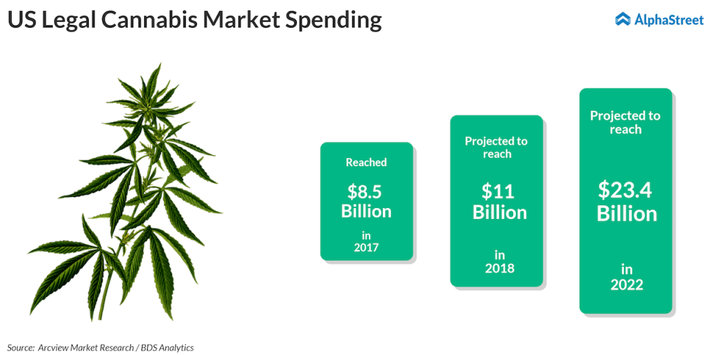 A report released by Arcview Market Research/BDS Analytics in June 2018 states that the US legal cannabis market is estimated to reach $11 billion in consumer spending in 2018 and $23.4 billion in 2022. The report adds that the global spending is expected to hit $32 billion by 2022. Also, the roll-out of international legalization is touted to reduce the US share from 90% in 2017 to 73% in 2022.