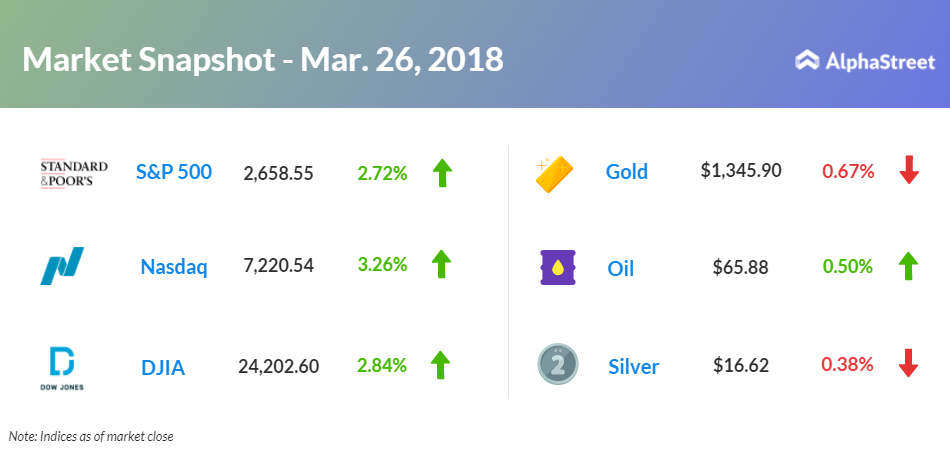 On March 26, US ended higher, with Dow up 2.84% to 24,202.60. Nasdaq advanced 3.26% to 7,220.54, and S&P 500 climbed 2.72% to 2,658.55. Lingering trade war concerns eased as the US has started negotiations on the Chinese imports tariff plan.