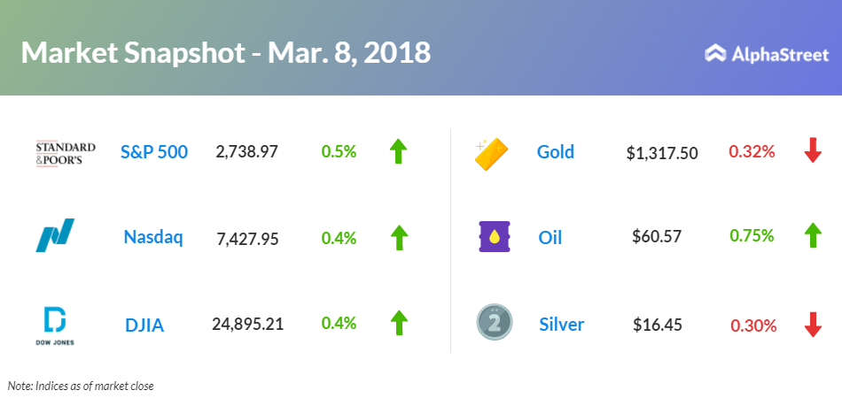 On March 8, US ended higher, with Nasdaq up 0.4% to 7,427.95. Dow gained 0.4% to 24,895.21, and S&P 500 advanced 0.5% to 2,738.97. President Donald Trump has confirmed the proposed imports tariffs of 25% on steel and 10% on aluminum. Trump suggested countries such as Canada, Mexico and Australia could be exempted from tariffs.