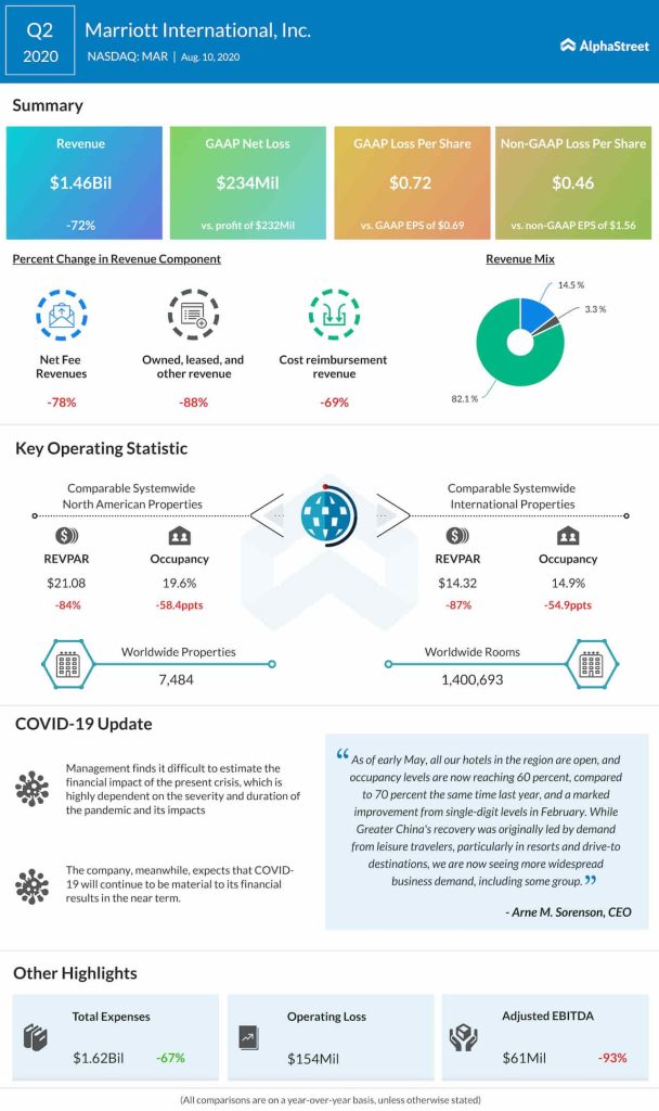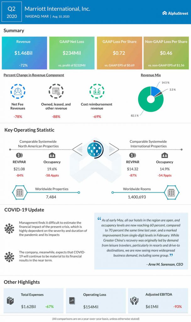 Marriott International Inc. (NASDAQ: MAR) reported a net loss for the second quarter of 2020, compared to profit last year. The June-quarter performance was negatively impacted by the COVID-related shutdown. The results also missed the Street view.
