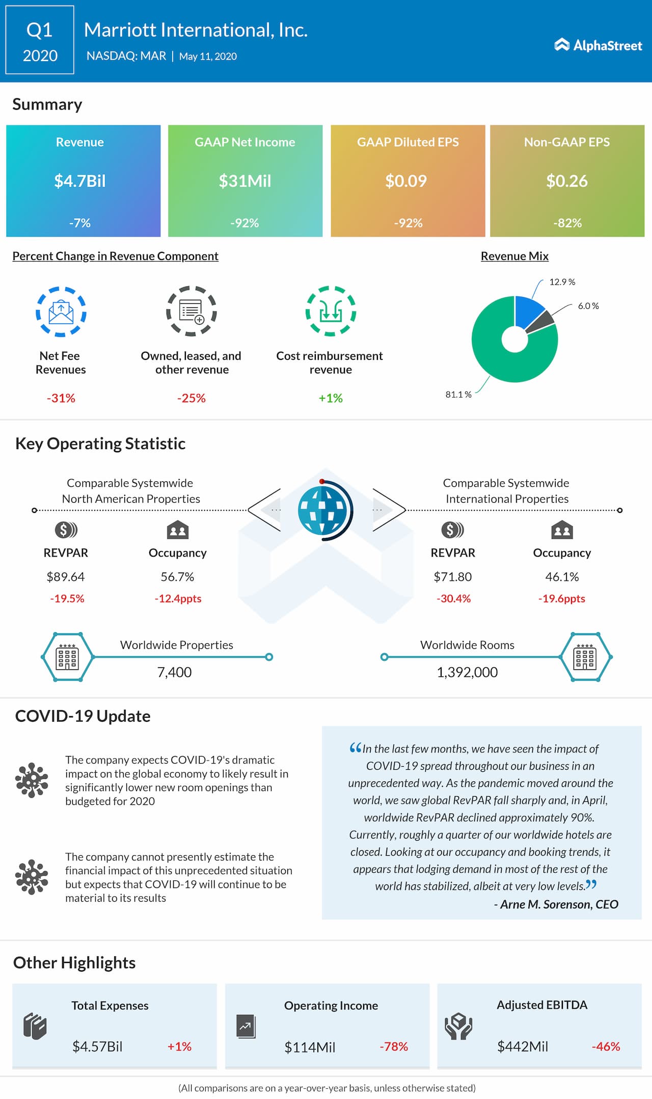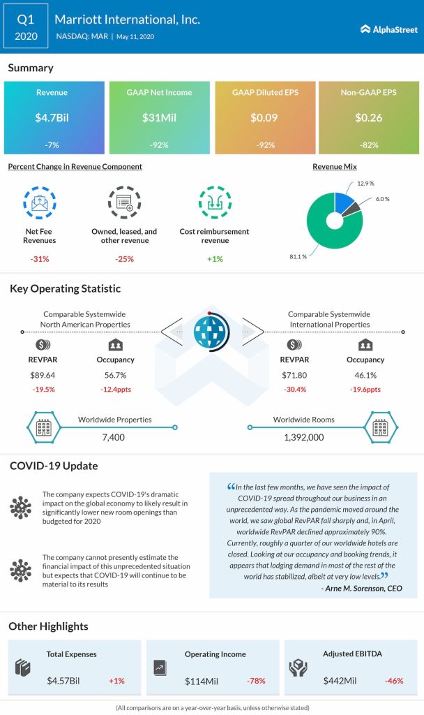 Marriott International Inc. (NASDAQ: MAR) reported its first-quarter 2020 results, which were dramatically impacted by the COVID-19 global pandemic. The bottom line was hurt by impairment charges, bad debt expense, and guarantee reserves related to the COVID-19.