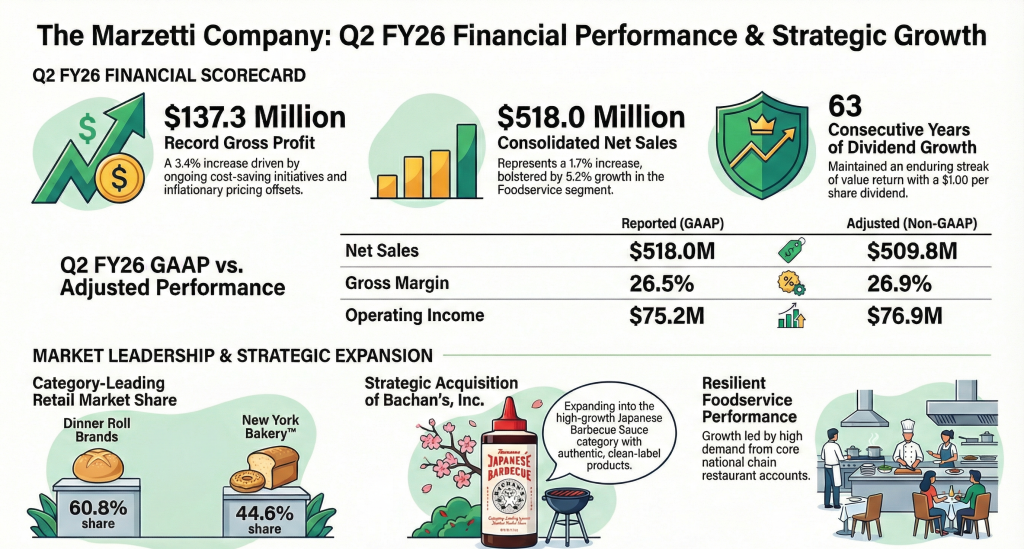 The Marzetti Company (Nasdaq: MZTI) shares were trading around $174, down about 1% in midday trading on Wednesday after the company reported second quarter fiscal 2026 earnings. The stock has traded within a 52-week range of roughly $153 to about $198, with recent price action showing modest volatility near the lower half of that range amid broader market caution on consumer-oriented equities.