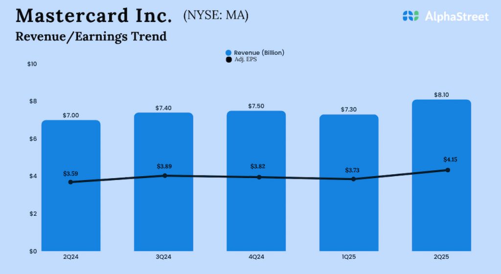 Analysts are projecting revenue of $8.53 billion for Mastercard in the third quarter of 2025, which represents a growth of 15% from the same period a year ago. In the second quarter of 2025, net revenue increased 17% year-over-year to $8.13 billion.