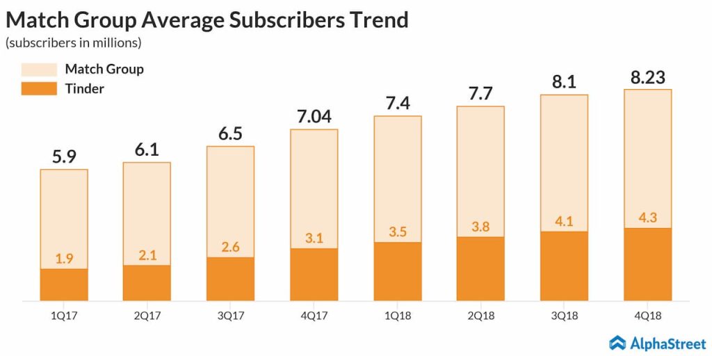 For the fourth quarter 2018, the online dating company posted GAAP EPS of $0.39 on revenue of $457 million. Revenue growth of 21% was driven by 17% average subscriber growth and 4% ARPU growth. Average subscribers grew to 8.2 million from 7.0 million in the fourth quarter of 2017. Tinder average subscriber base grew 1.2 million year-over-year to 4.3 million.