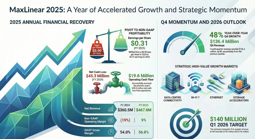 MaxLinear said Q4 net revenue was $136.4 million, an 8% sequential increase and a 48% year-over-year rise driven by strength across broadband, infrastructure, and connectivity product lines.