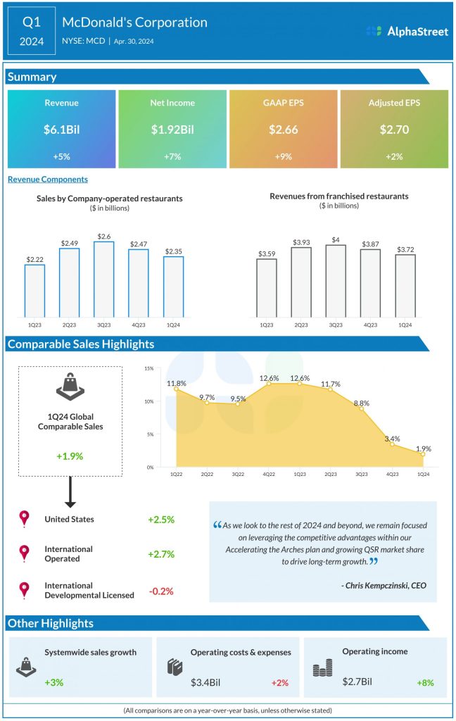 “McDonald’s Corporation (NYSE: MCD) reported first quarter 2024 earnings results today. Revenues increased 5% year-over-year to $6.1 billion. Revenue growth was 4% in constant currencies. Net income grew 7% to $1.92 billion and EPS rose 9% to $2.66 compared to last year. Adjusted EPS grew 2% to $2.70. Global comparable sales increased 1.9%. System-wide sales […]