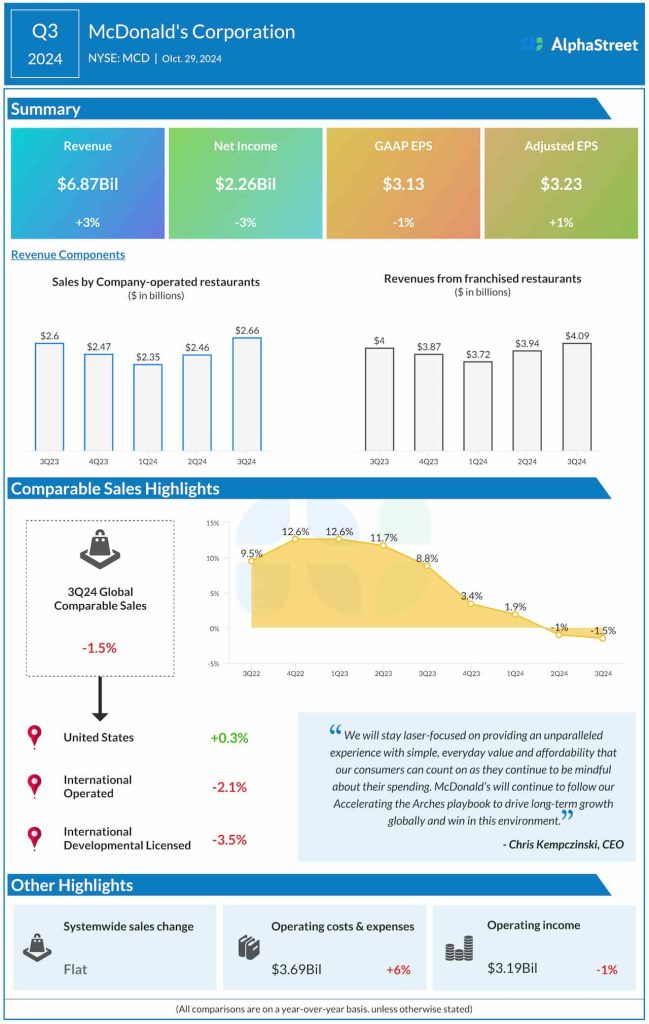 In Q3, adjusted profit increased to $3.23 per share from $3.19 per share in the comparable period of 2023. Meanwhile, unadjusted earnings dropped to $2.26 billion or $3.13 per share in the September quarter from $2.32 billion or $3.17 per share a year earlier. Global comparable store sales dropped 1.5% annually during the three months. At $6.87 billion, third-quarter revenue was up 3% year-over-year. Both revenue and adjusted earnings exceeded analysts’ estimates, after missing in the prior quarter.
