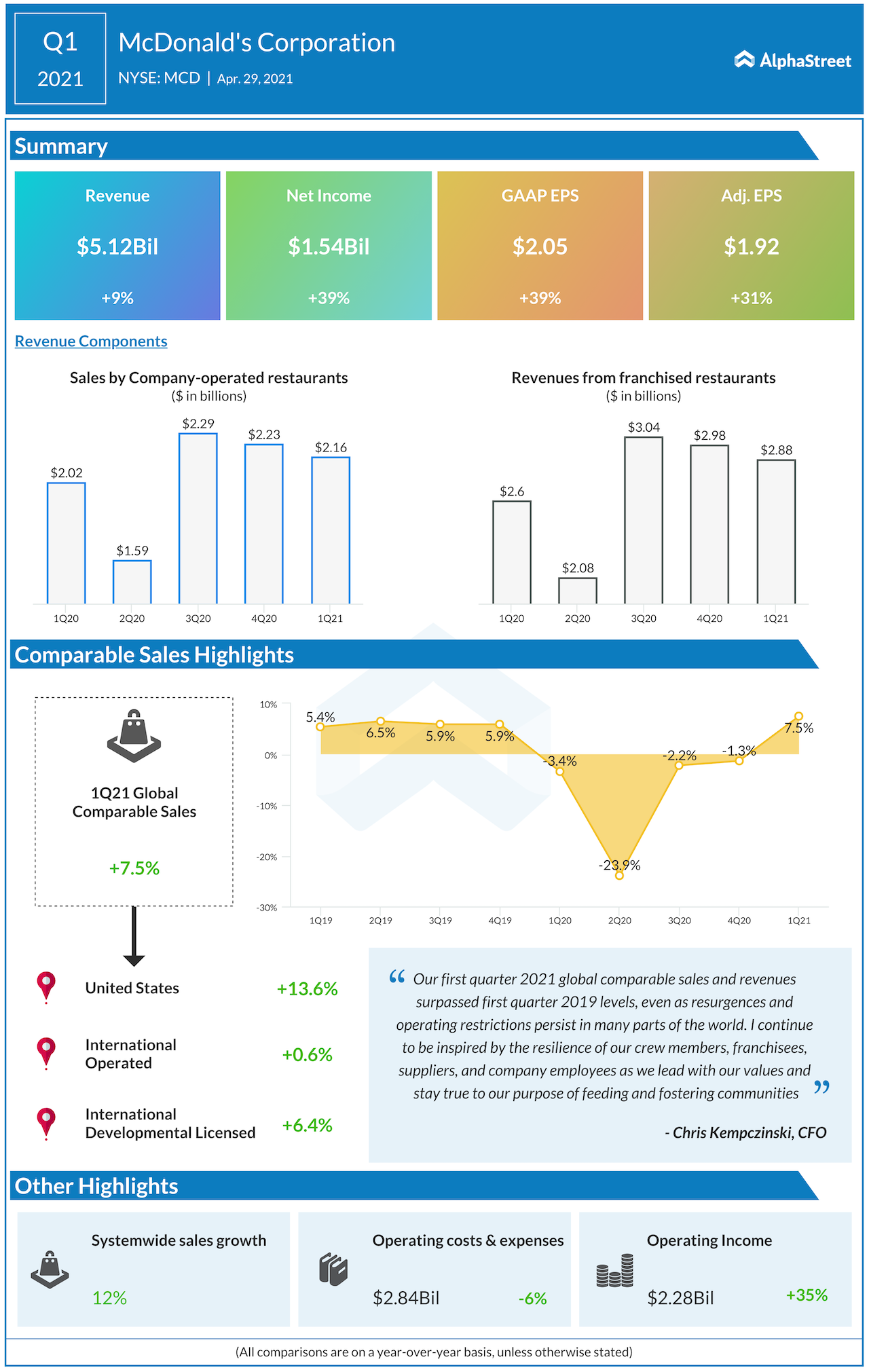 McDonald’s Corporation (NYSE: MCD) reported first-quarter 2021 financial results before the regular market hours on Thursday. The fast-food chain reported Q1 revenue of $5.12 billion, up 9% year-over-year and above the Wall Street projection. Net income of $1.92 per share was also above the target that analysts had anticipated.