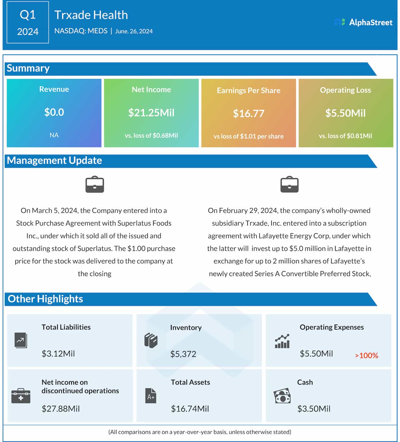 Trxade Health, Inc. (NASDAQ: MEDS), a leading health service IT company, reported financial results for the first quarter of 2024. The company reported a net income for Q1, compared to a loss last year.