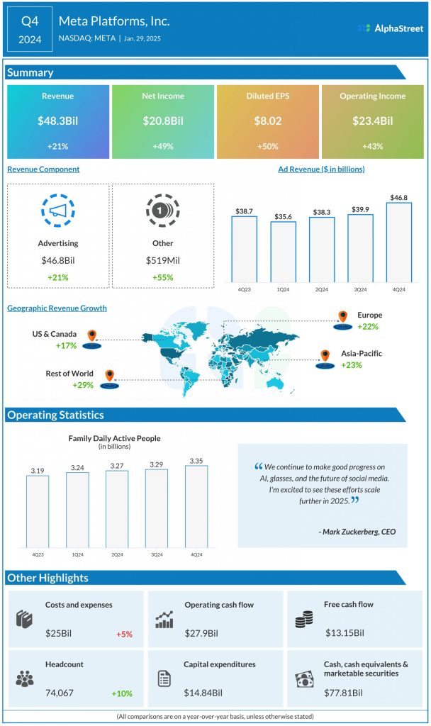 In the final three months of FY24, the company’s revenue rose 21% annually to $48.39 billion. Family Daily Active People, which refers to the total number of registered and logged-in users who visited at least one of Meta’s core products on a given day, increased 5% year-over-year to 3.35 billion in Q4. Net income increased 49% to $20.84 billion and earnings per share rose 50% to $8.02 compared to Q4 2023. Revenue and earnings both beat estimates, continuing a streak of quarterly beats for over two years.