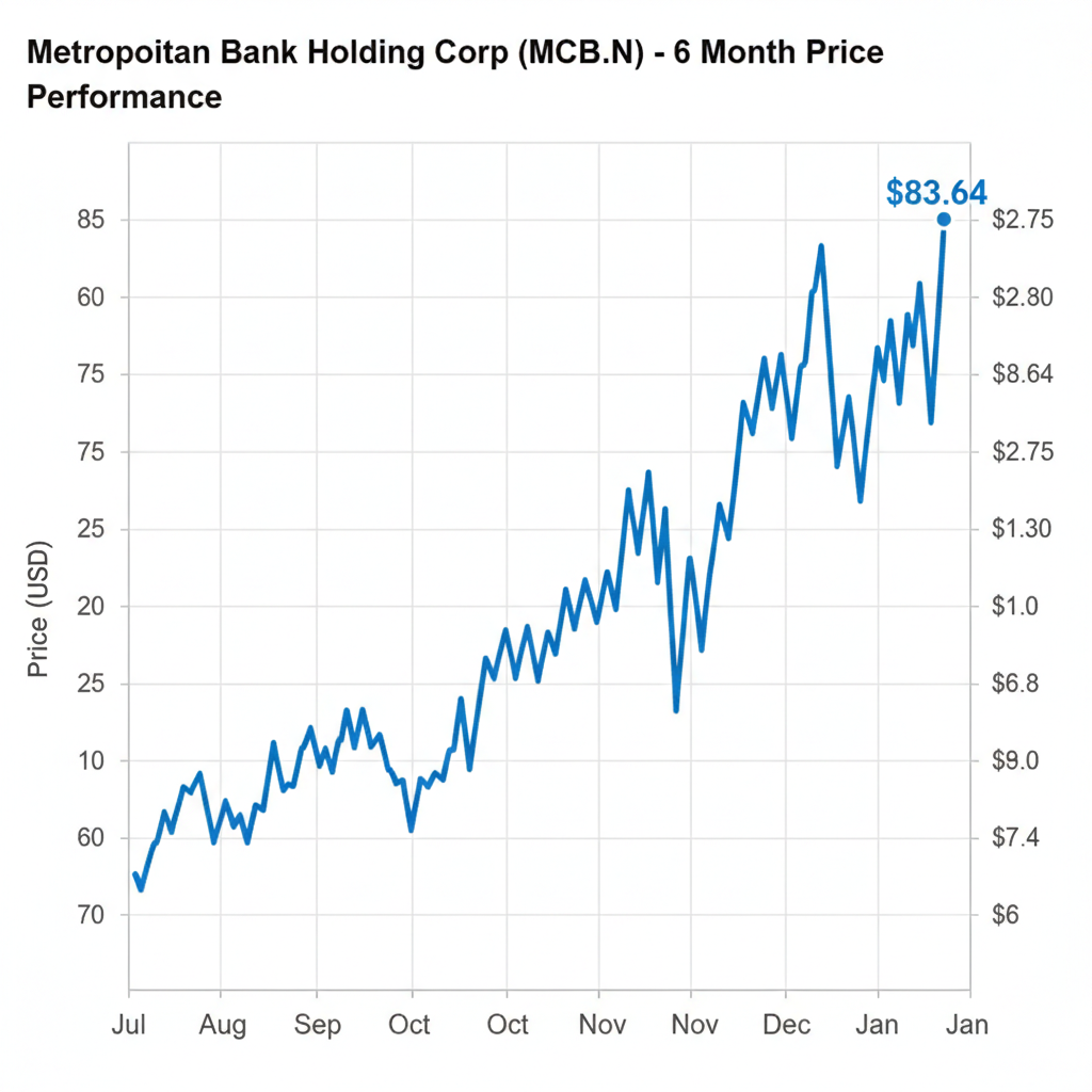 Metropolitan Bank Holding Corp (MCB) shares were trading around $79.63, down about 0.3 percent intraday on Wednesday, following a solid quarterly earnings report that did not spark immediate upside in trading. The stock has traded in a 52-week range roughly from about $47.08 to about $83.48, reflecting a strong rally over the past year but some recent sideways movement near the upper end of that range.