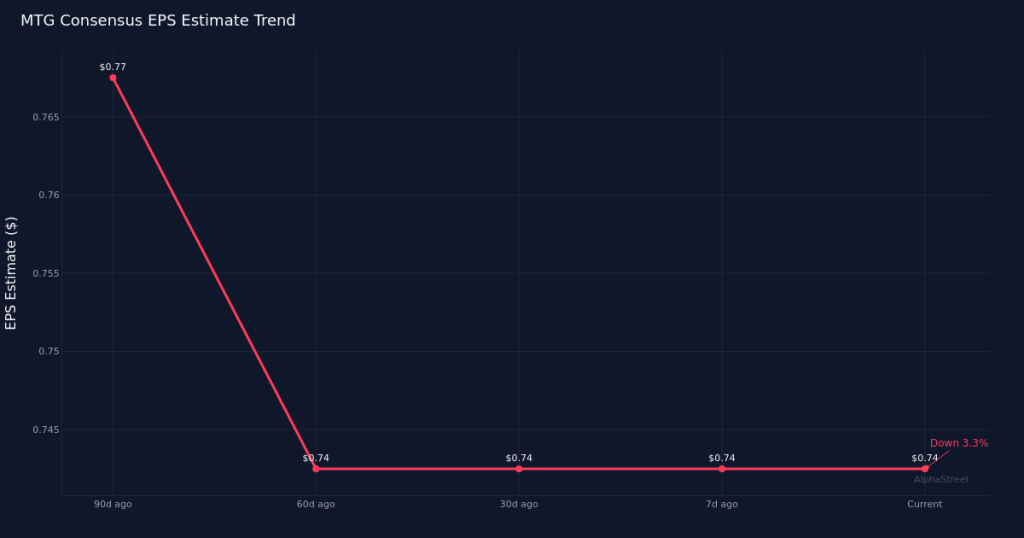Estimate trajectory shows gradual downward drift. The EPS consensus has held steady over the past month at $0.74, but the 90-day view reveals a downward drift of 3.9% from $0.77. This gradual reduction in analyst expectations suggests mounting headwinds or a more cautious outlook on the mortgage insurance market heading into the first quarter. The downward revision pattern, while modest, signals that analysts have tempered their optimism as they’ve refined their models with more recent data on housing market conditions and underwriting trends.