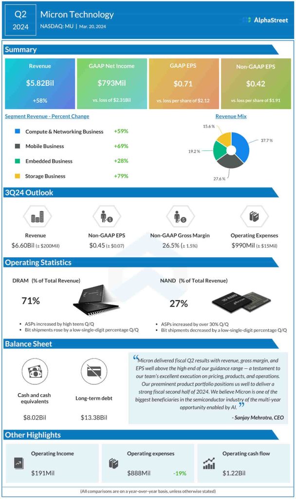 “We expect DRAM and NAND pricing levels to increase further throughout calendar year 2024 and expect record revenue and much-improved profitability now in fiscal year 2025. Micron is at the forefront of ramping the industry’s most advanced technology nodes in both DRAM and NAND. Reinforcing our leadership position, over three-quarters of our DRAM bits are now on leading-edge 1-alpha and 1-beta nodes, and over 90% of our NAND bits are on 176-layer and 232-layer nodes.”