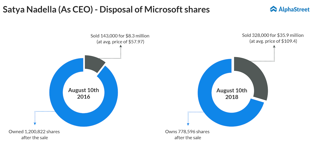 Last Friday, Microsoft chief Satya Nadella sold about 328,000 shares in the company, representing 30% of common stock he holds, at an average price of $109.4 amounting to a total of $35.9 million. After the Friday’s transaction, Nadella holds 778,596 Microsoft shares.