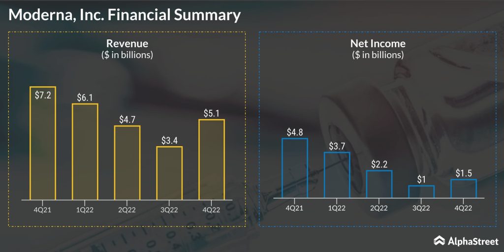 Moderna Inc. (NASDAQ: MRNA) reported total revenue of $5.1 billion for the fourth quarter of 2022, down 29% year-over-year due to a drop in COVID-19 vaccine sales.