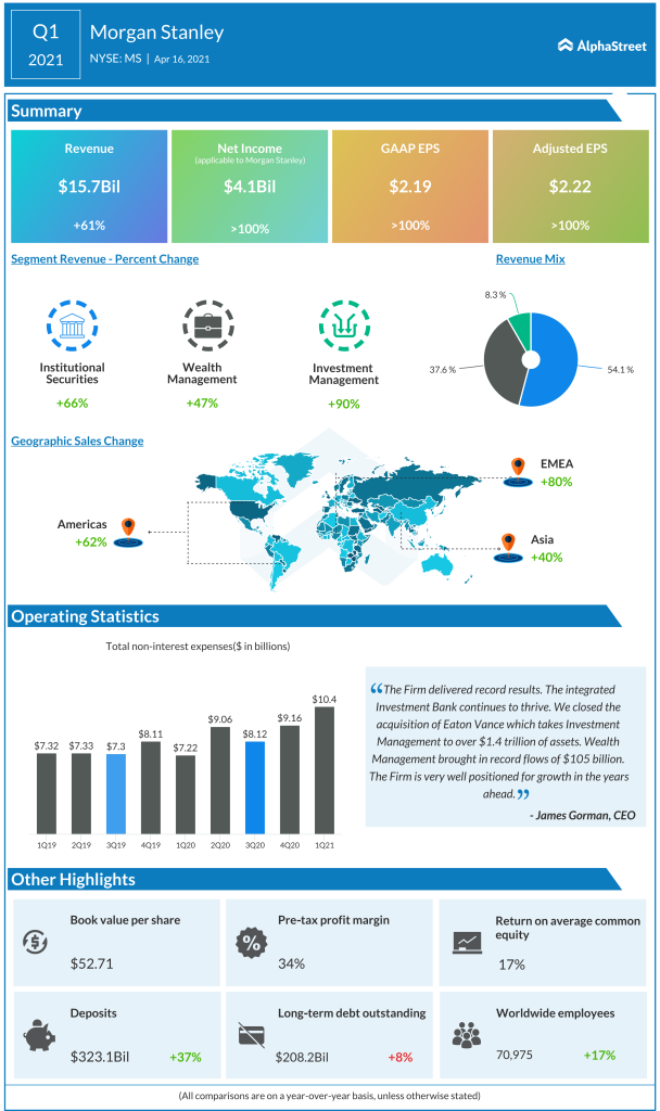 “Morgan Stanley (NYSE: MS) reported first-quarter 2021 financial results before the markets open on Friday. The banking titan reported a 61% rise in Q1 revenues to $15.7 billion, beating the Wall Street consensus. Earnings of $2.19 per share were also stronger than what analysts had anticipated. The net income increased to $4.1 million from $1.7 […]