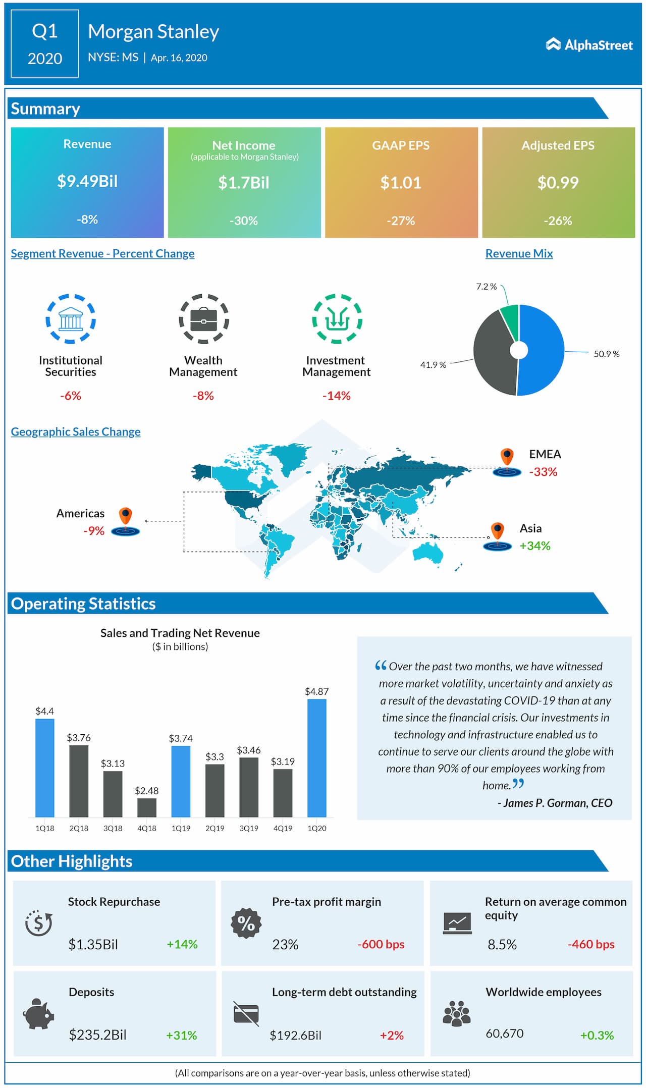 The company has voluntarily ceased its share repurchase program in the first quarter to better support clients with lending and other services during the global pandemic. The Institutional Securities segment experienced the impact of the deterioration of credit in the global markets while market headwinds impacted Wealth Management. The decline in global asset prices hurt the Investment Management segment.