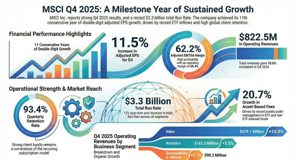 In the fourth quarter of 2025, MSCI reported consolidated revenue of $822.5 million, representing a 10.6% increase compared to the same period in the previous year. Net profit for the quarter was $284.7 million, a decline of 6.8% year-over-year.