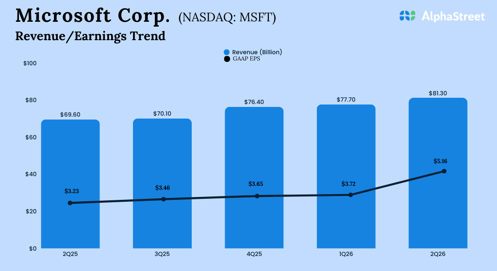 Microsoft Corporation (NASDAQ: MSFT) reported its second quarter 2026 earnings results today. Revenue was $81.3 billion, up 17% year-over-year. Revenue grew 15% in constant currency. GAAP net income increased 60% to $38.5 billion, or $5.16 per share, versus the prior-year quarter. Adjusted EPS increased 24% to $4.14.   Revenue and earnings beat expectations but the […]