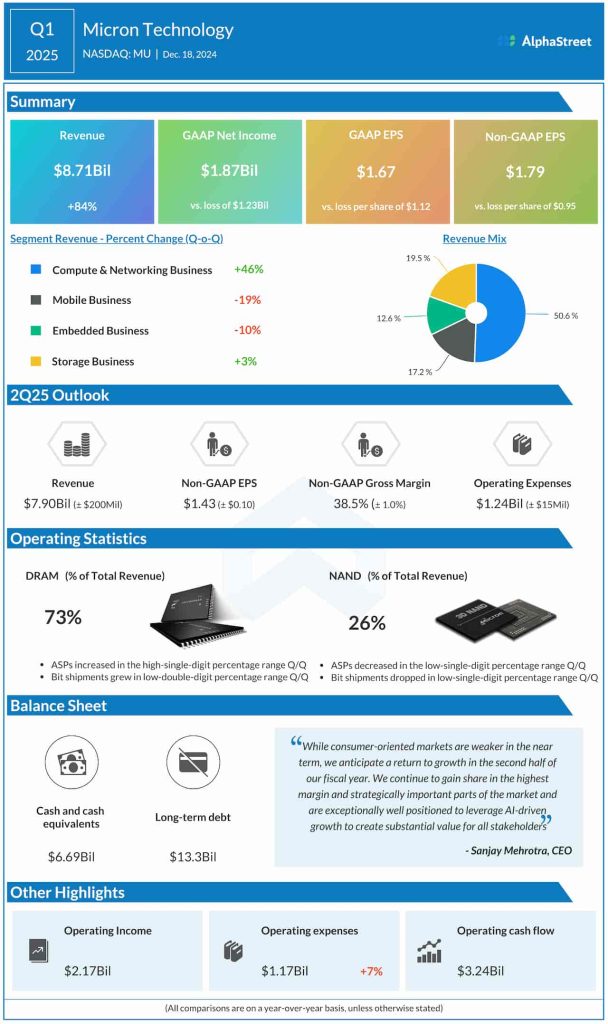 Micron reported revenues of $8.71 billion for the first quarter of 2025, sharply higher than the $4.73 billion revenue it generated in the corresponding period of 2024. A 46% growth in the Compute & Networking segment, which manages the production of DRAM and NAND memory chips and accounts for more than 50% of the total business, offset weakness in the other divisions by a wide margin.
