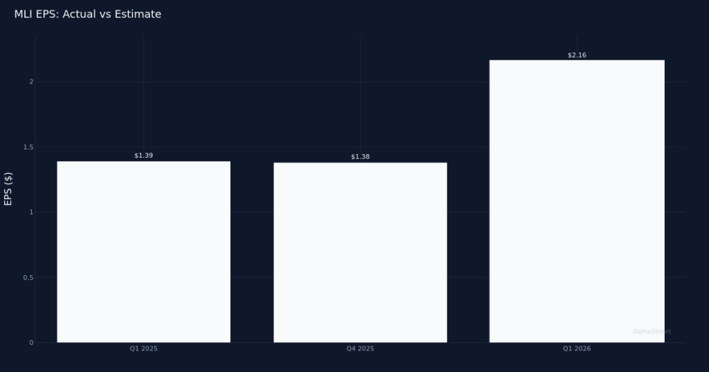 Mueller Industries, Inc. (NYSE: MLI) reported Q1 2026 diluted earnings per share of $2.16 on revenue of $1.19B, marking substantial growth across the manufacturing operation. The company earned $239.0M in net income for the quarter as demand for copper and brass products remained robust.