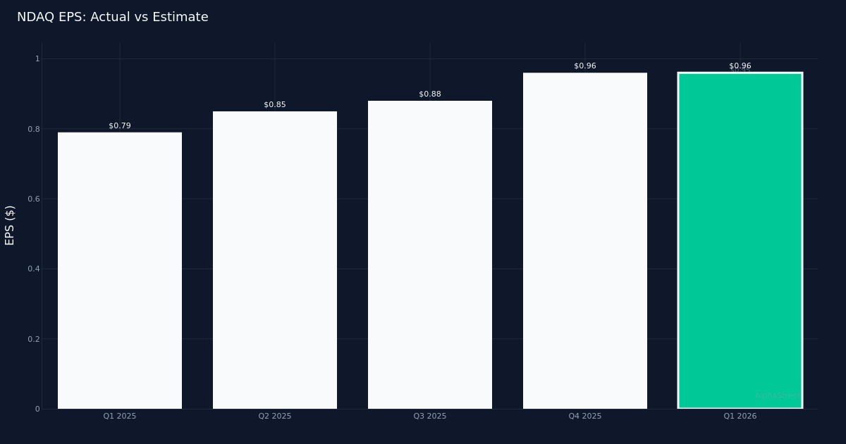 Nasdaq, Inc. reported first-quarter 2026 results that exceeded Wall Street expectations, delivering non-GAAP diluted earnings per share of $0.96 compared to the consensus estimate of $0.95, a beat of 1.1%. The financial markets infrastructure provider generated $1.41B in revenue for the quarter, representing a 14.0% increase from the $1.24B recorded in Q1 2025. The company earned $519.0M in net income during the period.