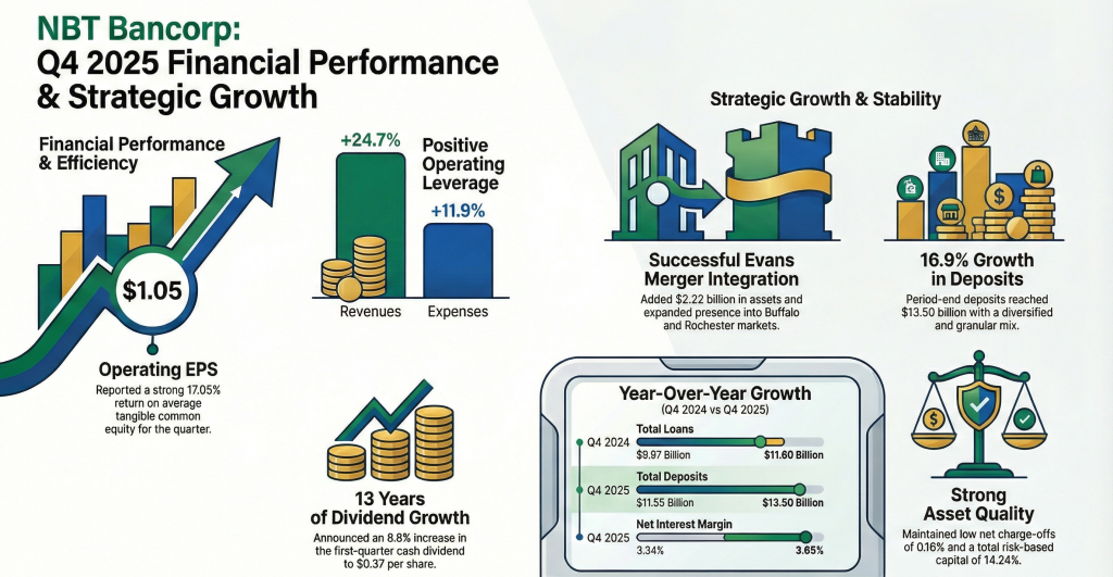 For the full year 2025, NBT Bancorp recorded a 21.4% increase in annual revenue compared to 2024. Annual net income reached $169.2 million. The company reported that revenue growth outpaced the 13.1% increase in operating expenses for the fiscal year, indicating a trend of positive operating leverage.