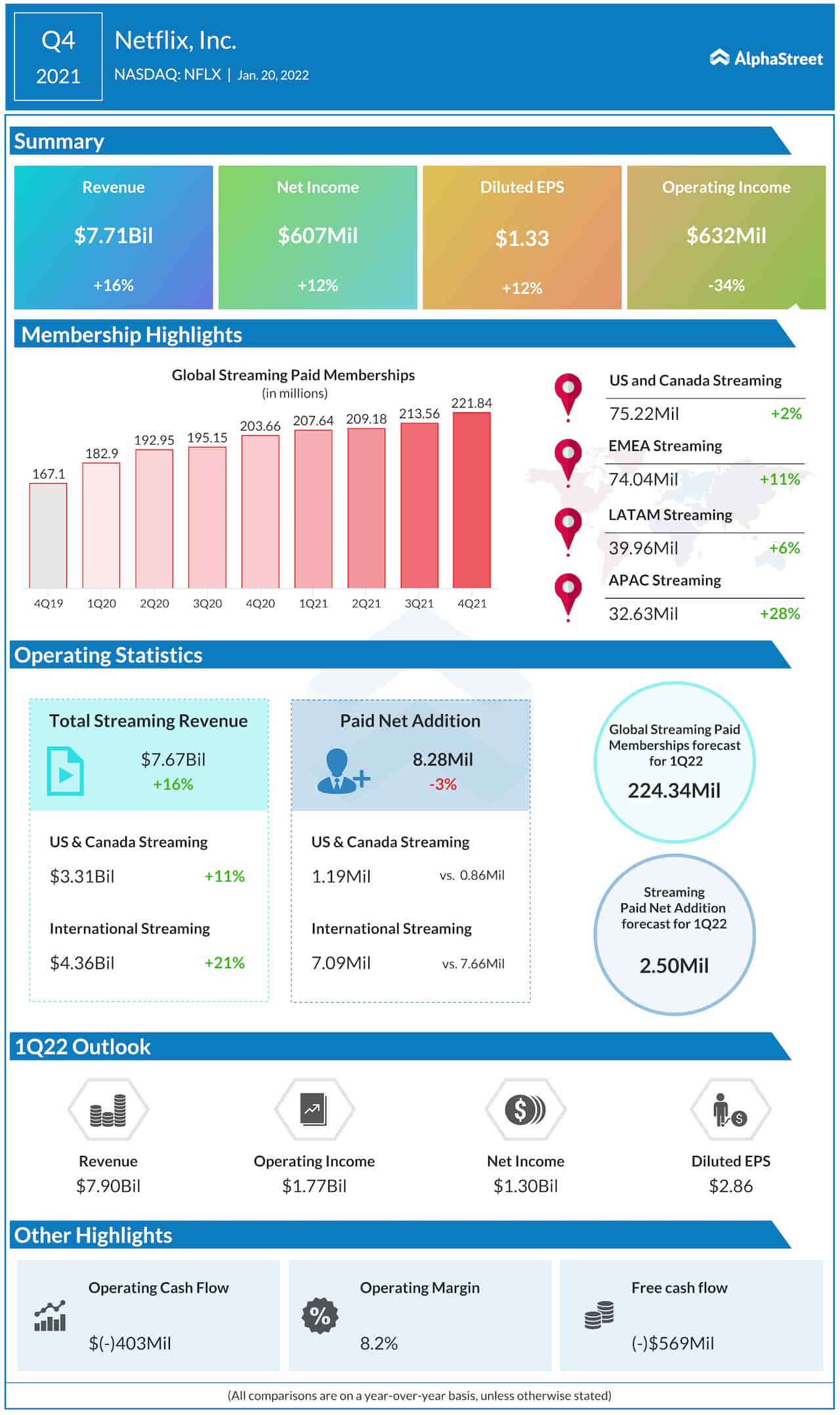 For the first quarter of 2022, Netflix has guided for revenues of $7.90 billion, which would reflect a year-over-year growth of 10.3%. The company reported revenues of $7.7 billion in the fourth quarter of 2021 and $7.1 billion in the first quarter of 2021. Analysts are projecting revenues of $7.93 billion.