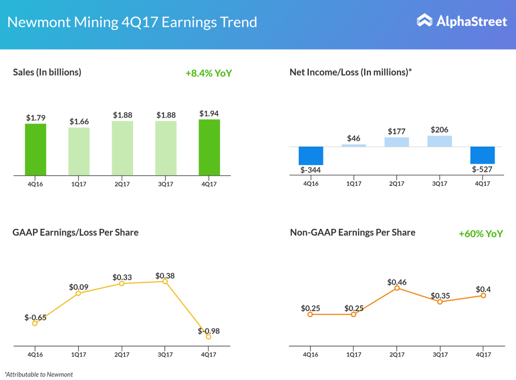 The gold miner recorded a $346 million charge due to changes in deferred tax assets and liabilities and a restructuring fee of $395 million. For the quarter, gold all-in sustaining costs (AISC), a key metric tracked by the Street, rose 5% to $968 per ounce.