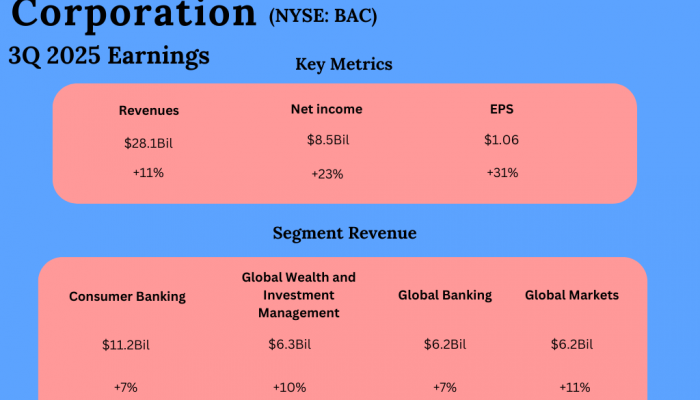 Bank of America Corporation (NYSE: BAC) reported its third quarter 2025 earnings results today. Total revenue, net of interest expense, was $28.1