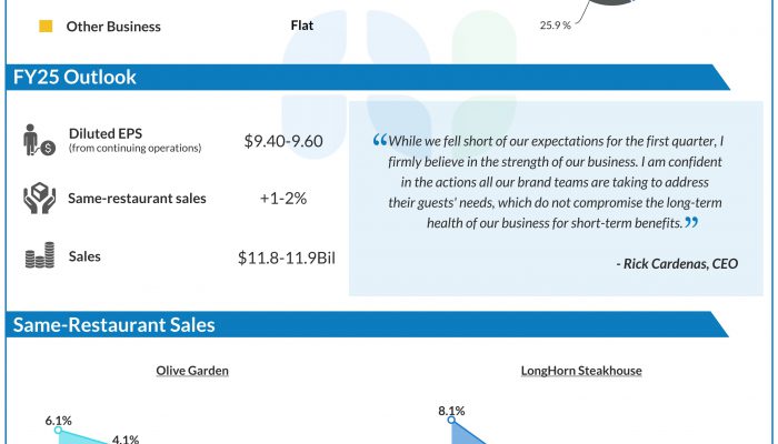 Darden Restaurants, Inc., (NYSE: DRI) reported its first quarter 2025 earnings results today. Total sales increased 1% to $2.8 billion compared to