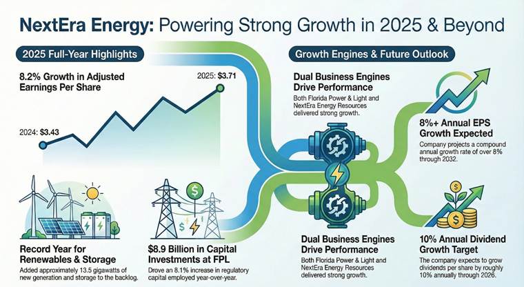 NextEra Energy reaffirmed its 2026 adjusted EPS target range of $3.92 to $4.02 per share and maintained its long-term goal of 8% annual adjusted earnings growth through 2032. The company also reiterated a 10% annual dividend growth target through 2026.