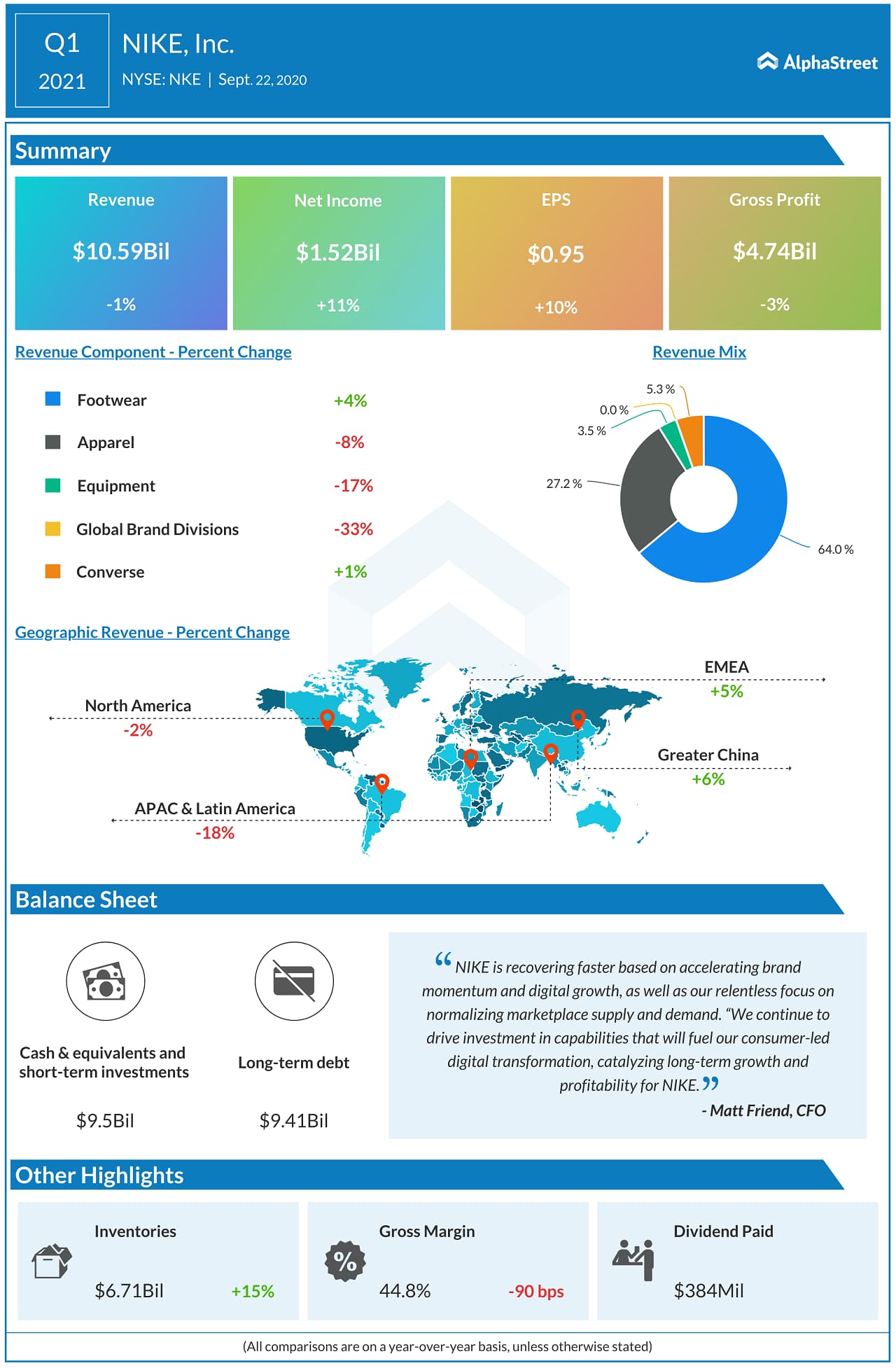Nike Inc.’s (NYSE: NKE) profit and revenue in the first quarter of fiscal 2021 surpassed the market’s estimates and sent the NKE stock up by about 7% in the extended trading hours. The sportswear giant reported a profit of $0.95 per share, up 10% year-over-year. Revenue declined 1% to $10.59 billion on a reported basis.