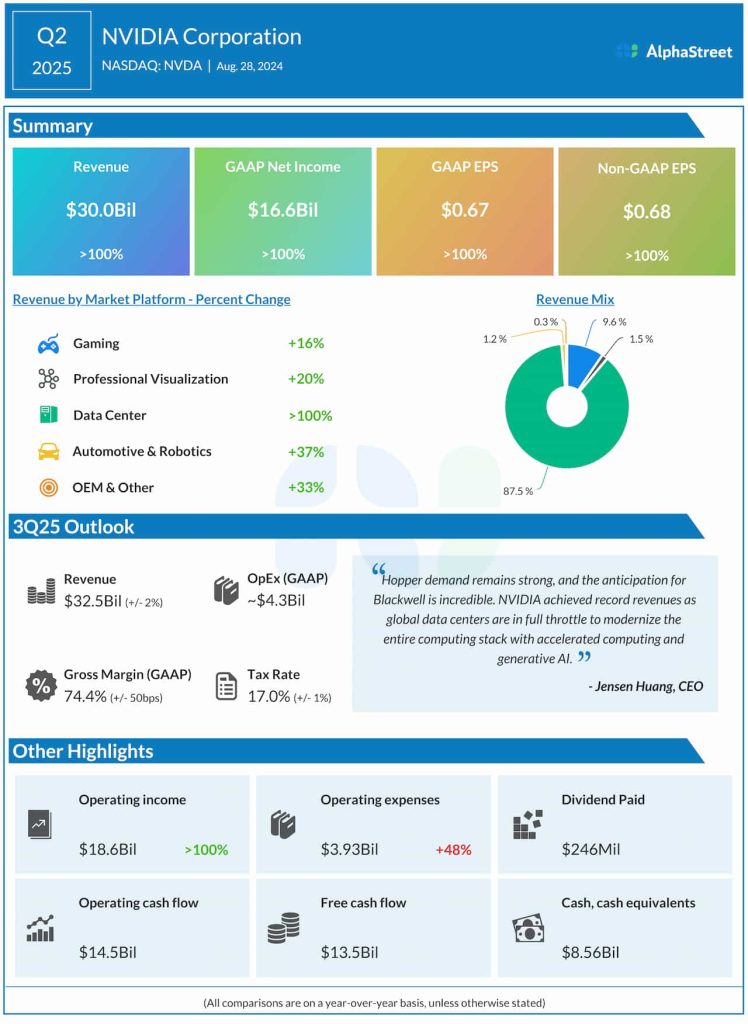 The tech firm’s revenues climbed to $30.0 billion in the July quarter from $13.5 billion a year earlier, thanks to strong performance by the Data Center and Gaming segments.